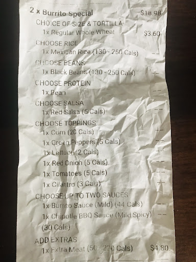 We had ordered Burrito 🌯 and even paid $4.80 for extra meat. Felt like I was eating a rice and bean burrito, there were only 2 thin slices of meat. I gave 2 stars because rest were okay. as far as the meat part is concerned, I understand the cost of everything and hence, we paid extraI for meat but there were only 2 thin pieces. I felt very deceived with paying extra for meat. I won’t order from this location and will never recommend!