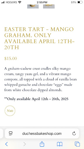 My 5-star review of Duchess prior to 2022 : Best baked goods in Yeg...a bit pricey but worth every penny. Mouthwatering macarons, cakes, tarts and baked goods. If you love chocolate cake try their Duke cake. Their monthly features never disappoint. I only wish they would consider bringing back their verrines - especially their choc mousse, coconut and raspberry flavorful...