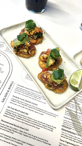 Came here for dinner with a group of girls on a Saturday Night of an Oilers home game. Loved the ambiance, service was 10/10 … the entire team worked very well together, were friendly and welcoming. Service was fast. Our server made great recommendations on menu items and was helpful. We shared the following family style: the Tuna Tostones, Carne Asada tacos, Ancho Hot Chicken, and Chorizo Borracho. The portions and plating format is perfect for sharing.