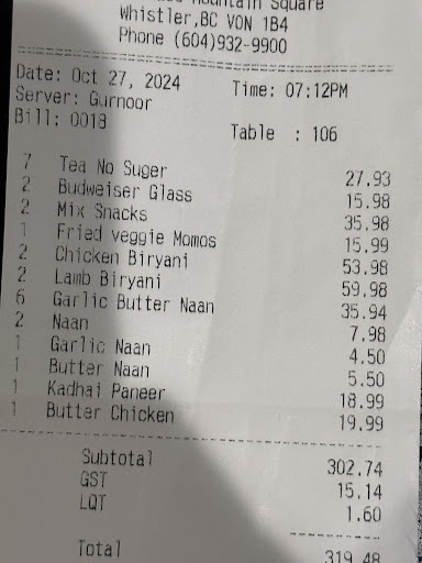 Read moreThe worst restaurant ever visited! We had a weekend trip to Whistler. Had an amazing two days except the pathetic experience at Indian Masala Bristo. The food is very overpriced with a very less quantity and tragic quality. Not sure if the entire dishes there is like that. Anyway we ordered butter chicken, channa masala, mixed grill, tandoori roti and Naan. Tandoori roti and naan looked same and was drenched in some oil. We ordered 2 mixed grill. It's served in a very tiny skillets and 1 didn't have even mutton pieces served wereas its mentioned in the menu and charged $40 each. Chenna masala and butter chicken was served in nano bowls and taste was also not worth. Since kids were exhausted after Gondola trip we finished it somehow. Then came the bill of $233. The bill was wrong with entries which we didn't even ordered. When requested to correct, they gave an updated one removing the wrong entries; but adding a new entry of service tax of additional $36. Seems otherwise they are adjusting that in the additional food entry. Since we didn't want to spoil our trip mood, paid and left the place.