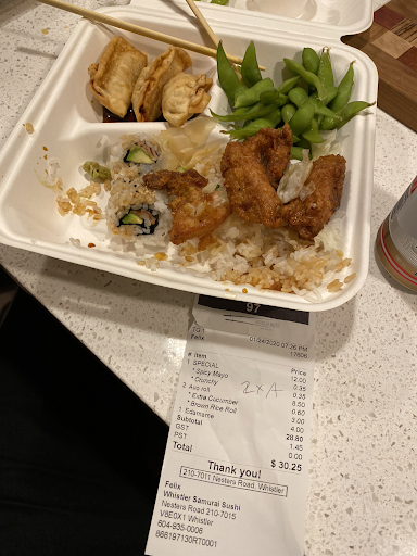 Read moreShockingly awful! The service and food could not be worse. This used to be our favourite sushi but it is hard to believe it is the same place. The teriyaki chicken was plain and sauce was horrendous. They should be embarrassed to serve this! Blend chicken with a squirt of supermarket sauce on top. Even the miso was horrible (how can you ruin miso?!), it had no fresh ingredients and taste like it came from a pack. My kids refused to eat it and I can’t blame them, I struggled to stomach it. To complete the premium experience I found a hair on my ginger and mentioned to the waitress, she took the hair away and that was it! She didn’t even ask if I wanted ginger (which is the bare minimum you would expect and with an apology for the disgusting situation, nope, she came back to clean another table like it was just the most normal thing ever, since when is ok to find hair in the food!?! Apparently at Samurai Sushi Whistler by Nesters road it is nowadays... It was just overall a terrible experience. Sad to see a great place gone down...