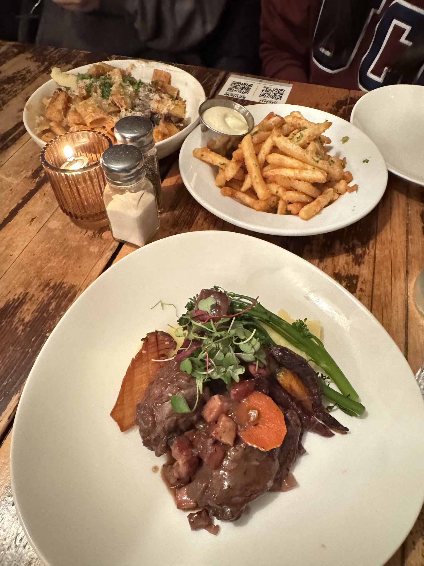 Service by our waitress was friendly but the food was way overpriced for they quality served. When seated, our waitress asked if we wanted some bread to start...$6...and we haven't even looked at the menu. It would have been nice if she had informed us there was a cost to the bread. My wife ordered an appetizer (they call it a "small plate") of surf and turf. Boy...they weren't kidding when they said "small plate". Two small pieces of pork belly which came very dry and tough and two scallops...$17 for that plate.