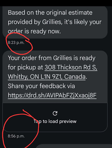 Read moreI recently had a very disheartening experience at the Grillies location in Whitby, Ontario(03/23/24) that I feel compelled to share. My mother, who wears a hijab, stopped by to order and inquired about the wait time after waiting 30 minutes for her order. Instead of a straightforward response, the staff member on duty at midnight dismissively said, "this is not a shawarma or kebab restaurant," which was not only irrelevant but came across as disrespectful, highlighting a lack of cultural sensitivity and basic customer service etiquette.