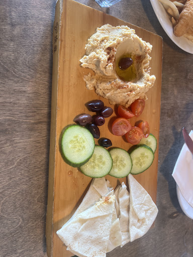 The food... unbelievable at these prices to drop at our table a plate of hummus with some cherry tomatoes, kalamata olives and sliced cucumbers and little else. Lacklustre presentation and hummus that by all appearances came from a can. Thin, cardboardy pita. Zero creativity. Bland flavours. Ever so slightly above work camp quality.
