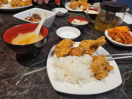 The service was very honest and friendly the chicken was juicy and cooked perfectly it was not overcooked and dry and slimy and fell apart nice and the outside was very crispy where you could actually hear the crunch unlike other places where it's just oily when you crunch into it you get a mouthful of oil this was actually light and the whole thing was very simple because it didn't need stuff to cover up the fact that it was high quality the kimchi was full of flavor and made in there with a nice garlic and flavor and same as the turnips which are very healthy definitely recommend coming here