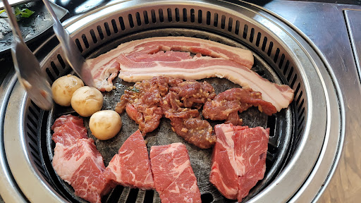 Small place. No commercial exhaust system (just saw a single intake, the type you'll find in a bathroom maybe). Narrow tables, small grills; those sitting before the grill will take the full brunt of the heat, smoke, and oil splatters. Grill also drips underneath the table onto your feet. Given metal salad tong with no insulated handle to grill with; tongs get hot fast, and has absolutely no grip power on the meat. Ordering system needs work, orders are done via smartphone with QR code. Servers have no way of tracking what was and wasn't brought out at all. Servers also lack self-awareness of checking table to determine what was missing or not; had half of our orders missing (includes easy items like drinks and rice) and had also got doubles of items (we somehow got 2 lettuce bowls when it stated 1 max per table, the 2nd came about half hour after the first as well and we clearly had a full bowl at the head of table). Confronting server on missing items was useless, just directed back to the QR code with no attempt to understand/communicate. When reordering -an entire hour after the first and talking to server- we still got missing items and the servers combined some reorders with the first order as well. Made ordering very stressful as they couldn't tell us if items were backordered/just missing, and we didnt want to over order and pay the extra $10 for every 250g of wasted food. Simple drink ordering needs improvement, menu gives 2 soda options but they also have other options if you look at fridge, and enter under "notes" when ordering (had to figure that out ourselves). Unique ordering system was not explained, had to figure it out ourselves as well. We did tell them it was our first time, but server only give us the QR code and that was it. Server never checked in on table; instead someone running from kitchen/front checked in on us once during the 2 hours we were there. I'll also like to note that the server was NOT busy (if they were the issues could've been excused). Literally stood at counter waiting to bring out orders. At 7-9pm on a weekday it was not busy. There was about 10 tables in the entire place, all those not currently in use was not cleaned or cleared during the entire two hours we were there. Server also made no attempt to help clear table of empty food tray/plates (even when moved to end of table), only grabbed them when they dropped off orders. Our table was in full view of counter where they stood idly. Again only the one girl we saw going from kitchen/front took away the empties outside of bringing orders. Cannot handle larger parties, we were a group of 6 small Asians using the only bigger table they had (single grill still). The table barely fit us all. Tabletop was already crowded with just our plates, grill, drinks, and 3-4 orders. We initially made a reservation for 7 and one member couldnt make it; we were assured our larger party was of no issue. Food was okay. Meat was alright, seafood of low quality, korean pancake was 90% pancake. Menu could use additional description, the meat had different marination but no details were given to some at all.