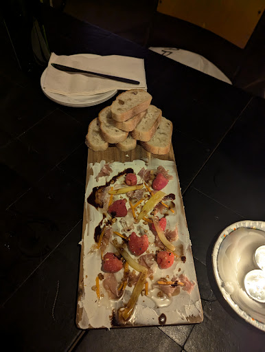 I like the concept of this place. It's a hidden gem. There's is a roof patio with a bar, but you better book a table in advance, especially if they have a special event there. The lower level has a mysterious, dark lightning, but it's still cozy. It's a small space. Service is good, polite and attentive. I like their cocktails, however their sharable board was ridiculous. I asked a server if it's shareable and big enough for company of three, and be said that all the meals are shareable. We were waiting for our dish for a while and then get 7 pieces of baguette, some meat (it's not a prosciutto), some vegies and cheese smeared with a thin layer. It wasn't bad, but it was weird to scrape your order with a knife from a wooden board. It's not enough for...