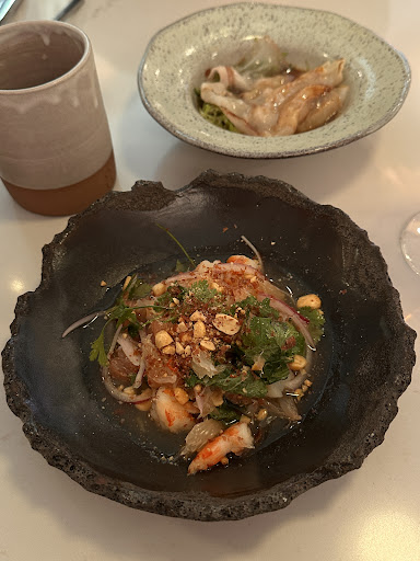 As for the food, I really enjoyed the bison tartare. It was very different from other tartares I've had before — the mix of flavors was unique and surprisingly well-balanced. I also liked the prawn salad a lot. It was refreshing, with a nice balance of sweet, sour, and savory, almost reminiscent of Thai cuisine. The black cod was fresh, and the mushrooms on the side were flavorful too.