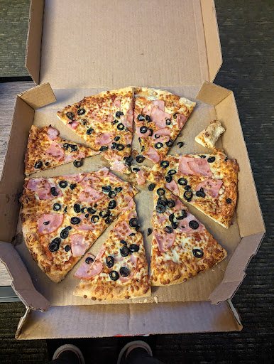 The pizza is standard for a dominos location. Over a few years of ordering here for parties, usually pickup, I've come to really dislike it. They lie about the pizza readiness state in the app; I assume that this is to fulfill some sort of quota or bonus threshold for performance times, but it is just frustrating as a customer when the app and the screen in the store both say your order is ready, and then at the counter you're told its just gone into the oven. That counter interaction can take quite a while too, as I often find myself completely ignored when I walk up to the counter. I have observed this with most other customers I've seen in the shop as well. Despite 5 people working, 2 of whom are standing in the back hallway talking to each other, customers are left standing at the counter with no greeting whatsoever. I understand if everybody working there is tied up and they ask me or another customer to hold on a minute and they'll be right with me, but that's not what happens. Instead, the staff awkwardly stare at you, but say nothing. They just look at you as you stand there. I've tried saying excuse me or hi, but they do not respond and just stare. It is a very awkward experience to be 10 feet away from three staff members who are all looking at you and yet refuse to acknowledge you in any way. Even more frustrating is when the staff are talking amongst themselves, while staring at you, yet not acknowledging or addressing you in any way.
