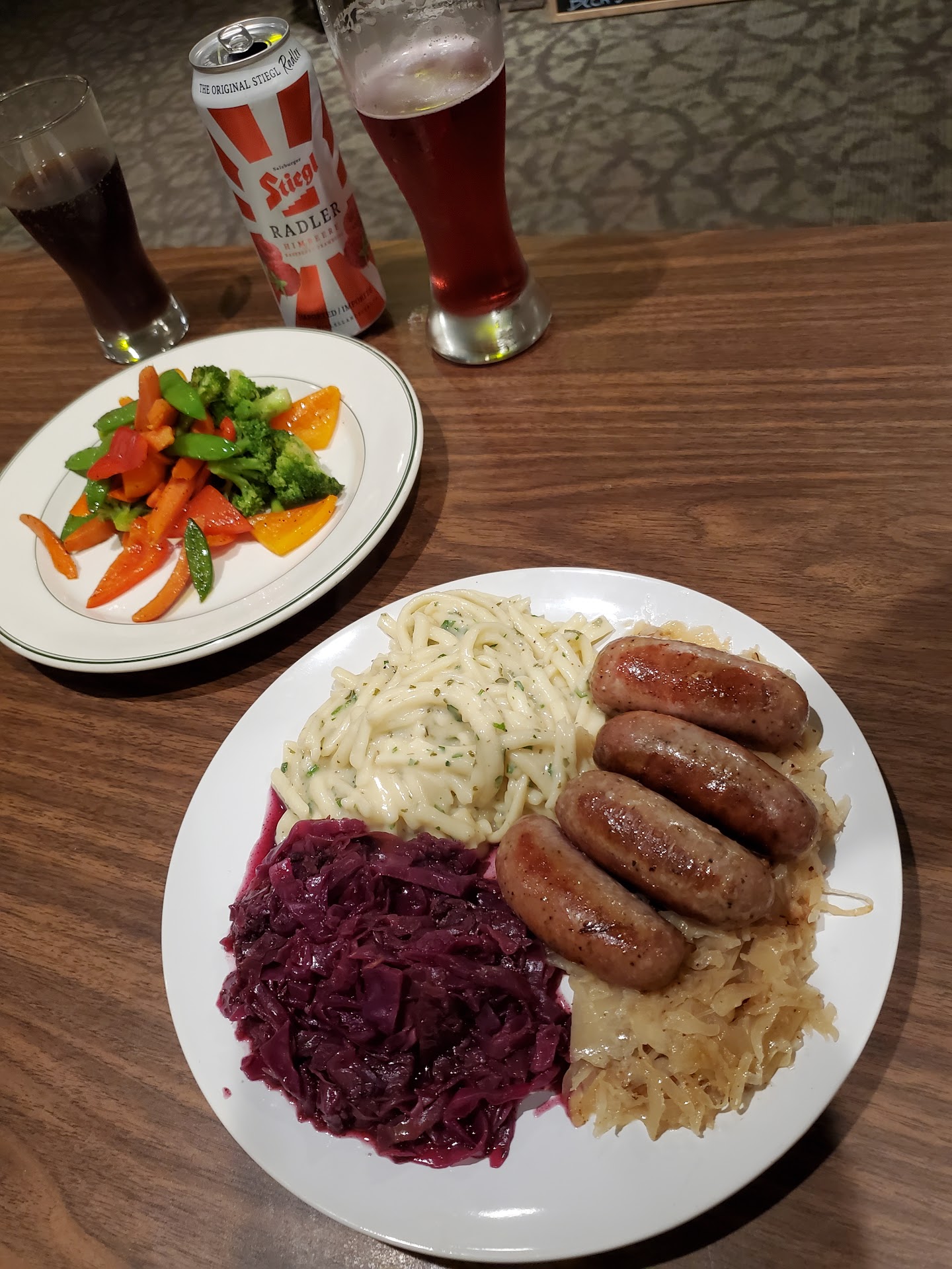We had the Chicken Schnitzel which came with red cabbage and spatzle. We also had the Bratwurst which also had the cabbage and spatzle. We also tried the hand cut veggies with butter and caraway seeds.