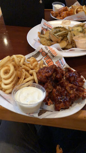 The atmosphere was alright, kind of typical of a "sports bar" as you'd guess, seemed to only be playing country music for the whole restaurant which we're not fans of but tolerated. They then switched to a hockey game broadcast suddenly at one point which was only seemingly shown on the T.V.s on the bar side of the restaurant (we were on the other/regular side in a booth). I have to say that I was pleasantly surprised by the size of the booths and the "wiggle room" in them, more than ample space between the seats and the tables.