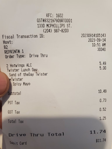 November 28, 2024, KFC McPhillips: order 9 piece chicken with large fries and 2 individual gravies, 10 pieces hot wings, and large salad. Hot wings were fresh as they were made to order, but 6 out of the 9 pieces of chicken were dry and hard as if they were sitting for awhile then re-fried. There were only 3 pieces of chicken that were fresh and tender. Very disappointed in this location that they would sell this to a customer. The price is not cheap and the chicken should be fresh all the time. It's funny how this location never replies to the complaints. I guess one has to call the head office directly. Old review: Ordered extra crispy 20$ fill up comes with fries and gravy. Wait time under 15 minutes. Always very tasty and fresh. This location is alway clean and the staff for the most time are friendly and professional. Only issue i had this time which i didn't appreciate, was staff at cashier called for next person before i could put my coins in my wallet. Proper Customer Service is to give time to do that as some customers have disabilities and it take a bit longer. Could be a training issue. Recommendation, it would be nice to have the honey bbq chicken (non spicey) back. It was...