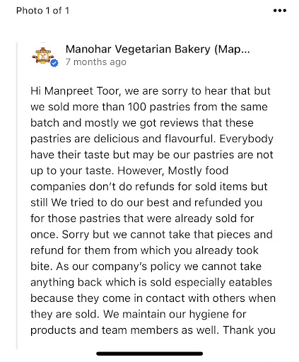 Read moreWorst cake i have ever tasted. So, i customized cake from this Manohar bakery for my husband. They charged me $50.00 for that also drove 30 mins to pickup this disgusting cake. When we tasted the cake it tasted like food colouring( supposed to be a pineapple cake). The centre was not sweet enough and little dry. I called the shop to complaint about it. They said every person’s taste buds are unique( so informative by the way) and nothing’s wrong with that cake. When i asked them how they were going to fix the problem they said the cake was non- refundable and nothing can be done. On top of everything they hung up on me, so unprofessional. I would never recommend this bakery to anyone. Honestly ruined my day. I wish i had gone to some other bakery. I literally wasted so much time resenting myself for choosing them and not to forget wastage of food. Well i hope it made them happy. I wanted to go back and throw that cake back in the shop but then my husband told me its pointless. These kind of people are shameless. Well learnt my lesson, never recommending this...