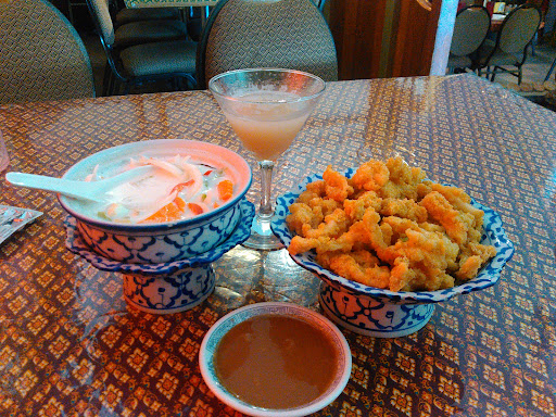 Starters: Battered Calamari badly overcooked and greasy. Don't. Chicken Satay a bland choice. On the other, the #40 Thai Vegetable salad is a winner. Large enough to share easily. Get it.