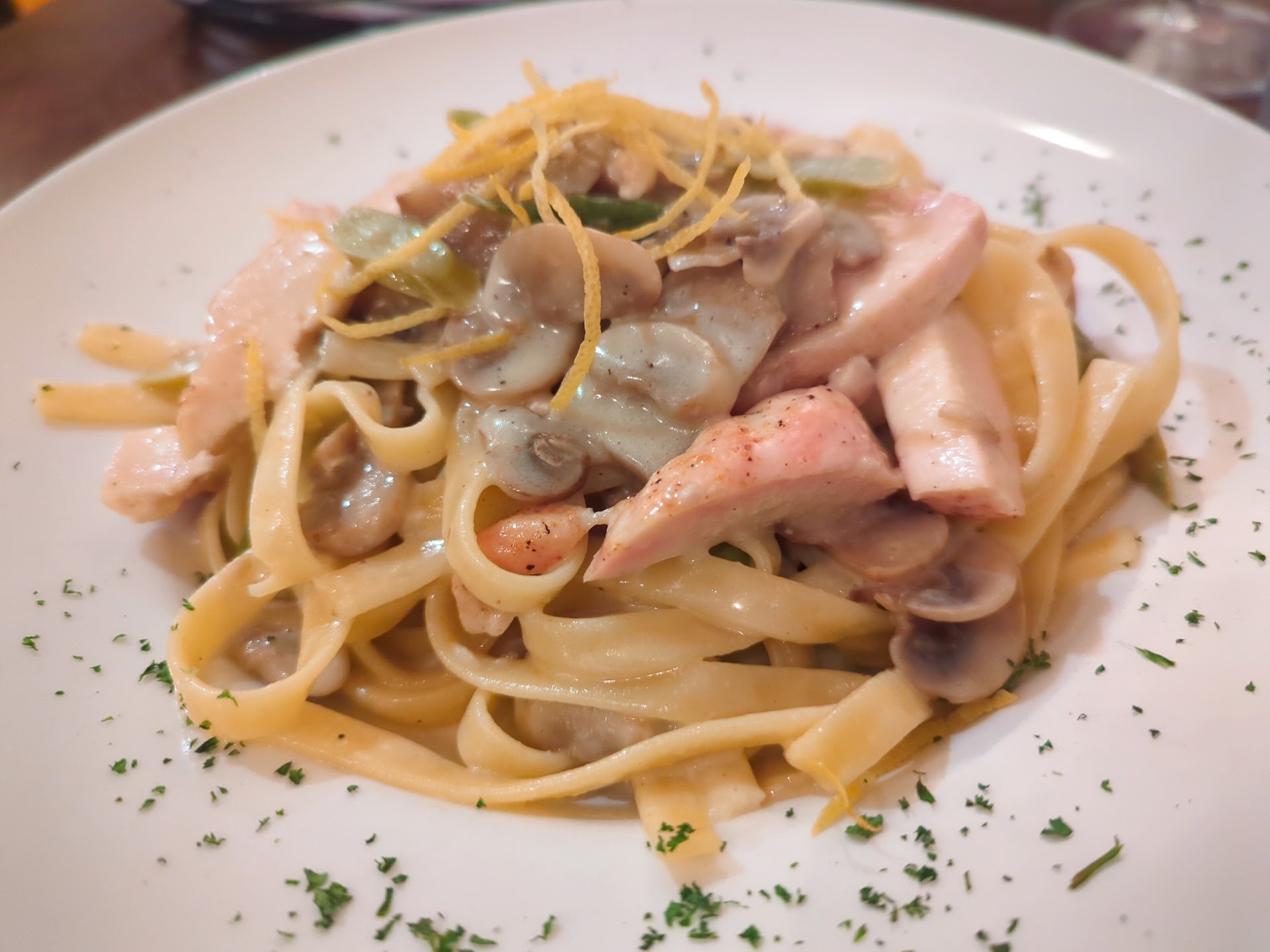 We made a reservation for a Saturday night, which we later found out was a good idea since they were all booked up and could no longer accept walk-ins. We got a cozy table near the back of the restaurant and our server was very friendly and attentive. My partner ordered the original sangria (which was delicious - I kept stealing sips) and we got cheese toast to start, which was freshly baked and sooo yummy! Our mains were the penne rose and fettuccine pollo lemone and we were very very happy with our choices! My partner kept raving about the rosé sauce and I was in love with the limoncello cream in my dish. (We also got some complimentary fresh focaccia that I did NOT have room for but ate anyway because you can't just go to an Italian restaurant and say no to bread.)