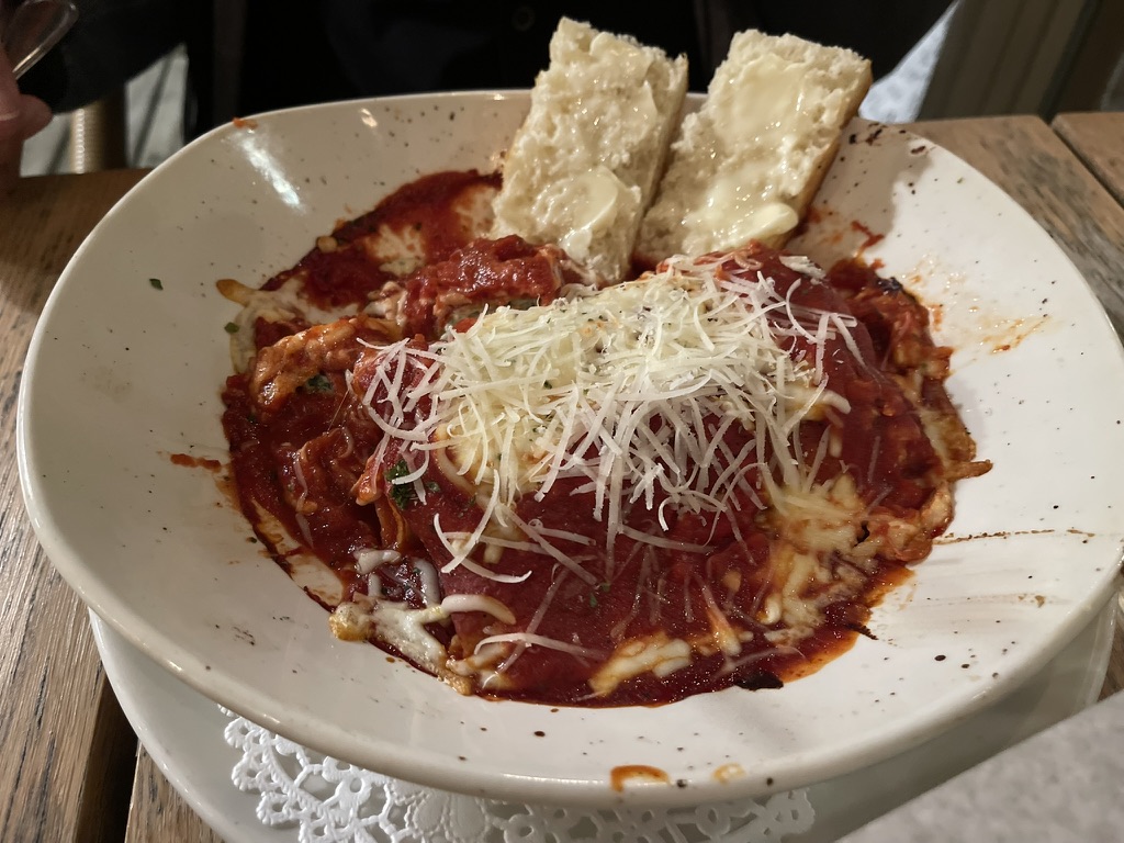 As for the food, everything was delicious! The calamari was tender and served in a standard portion. I had the Antipasto salad, which was flavourful and the soup was overflowing. Both of our pasta entrées were very tasty; the Sambuca Chili Cream Pasta was creamy, rich, and just the right amount of spicy, while the other entrée had a tomato sauce that was truly next level. The bread bowl was appreciated as we waited in between courses. The price point for each of the dishes was appreciated and the food was very good.