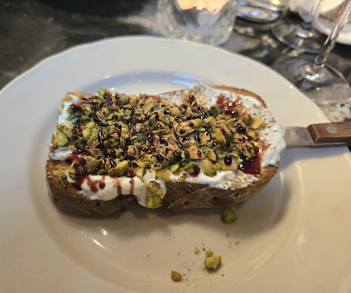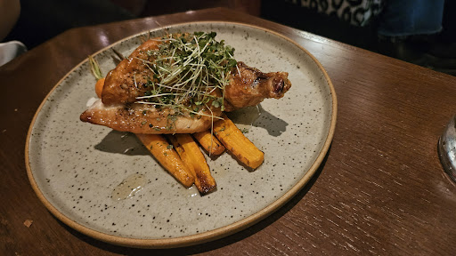 I love the fancy zealous nature of this place. The architecture is very pretty and there is also a fun aspect to the atmosphere with the funky prints that the place has. I would HIGHLY recommend coming here for lunch. Their cafe drinks are delicious and sizeable for the price ($6) and the presentation is gorgeous! The charcuterie board ($22) is also delicious. I was surprised cheese was extra, but I found that cheese was not missing on the charcuterie board as it was incredibly flavourful and kept me decently satiated for a bit. The alcoholic beverages do seem a bit small, so if you are someone who is a lightweight like me, I suspect you will be able to have quite a few without getting buzzed, which is a plus for me. The drinks are also gorgeous with different garnishes and glasses for presentation and are quite tasty. The sourdough toast is also absolutely delicious and filling. Dessert is never a miss! Unfortunately, I would not recommend their entrées at this point. My rule of thumb with entrées is I am happy to pay a lot for a small portion if it is absolutely amazing, or to pay a lot for a moderate or large portion if it is mediocre or good. Unfortunately, the chicken entrée ($25) was a small portion and was ... okay. I was perplexed because when I cut into it, it squirted out juice, so I thought it meant it should be juicy but it tasted... dry? The salmon ($35) was definitely better and I loved the char on it, but there was not a lot of flavour in it. If you really love the taste of salmon, this is for you! I like salmon, but I do like just... slightly more flavour. The staff were amazing and have been very friendly every time. I am sure if I brought it up they would have replaced it or refunded me so I am giving them a 5 on service. I was just trying so hard to like it and tried to find the chicken tasty but at the end of the supper, once I got home, I was a bit dissatisfied and hungry. They may improve on their entrées yet and I have faith, it will just take me a while before I can afford having supper here again. I will definitely come here for lunch or brunch again as they knock that out of the park and I crave the sourdough creations and I absolutely adore their coffee drinks and occasionally like to try their...