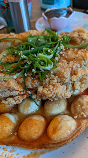 Their take on Asian flavor inspired Waffle and Chicken was amazing. Bubble waffle made with buttermilk and coconut flavors Topped with umami and crispy double fried chicken. accompanied by coconut cream butter, umami bases soy garlic sauce, hot sauce, and sweet salty waffle syrup. Garnished with seasame seeds and scallions. This fried chicken and waffle take should be a mainstay.