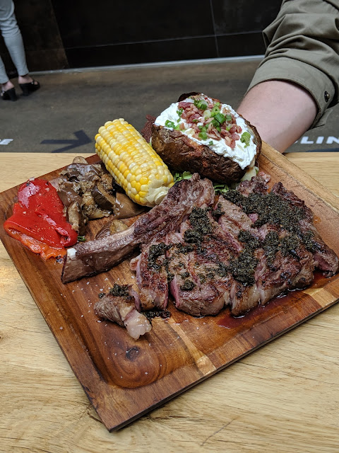 Bad: the rib steak was a bit sinewy. So I did have some issues with cutting it with a butter knife if I read into one of those parts. The cheese on the baked potato was overwhelmed by the sour cream making it a bit of an unnecessary addition. One or the other, with both it's a bit wasted. It doesn't make it worse, just not better A touch pricey