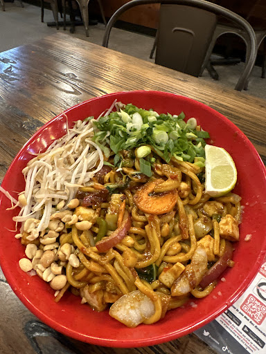 My sweet Mongolian udon with vegan chicken was really quite good, I thought! I appreciate they have at least a few vegan options!! My friends said their meat chicken was kind of rubbery and rice was overcooked and kind of dry. One friend didn't realize the orange chicken is only chicken and rice (no veggies), so that should probably be made clearer. One order with extra protein was still honestly barely any chicken, I think we counted 6 small pieces, and the server confirmed it was with extra added. That was really stingy!