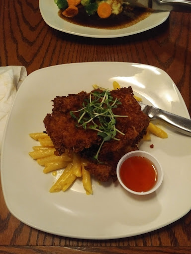 First and foremost the food here is really good. It is obvious they take the time to prepare fresh and flavorful food. I can't say that the service is the best I have received. My waitress was friendly and nice but very rarely visited our table, we had ordered appetizers and my fork was taken when they were cleared, when my main course arrived the runner dropped them off and left before I could say I needed another fork, I ended up having to find my own at the server station. Normally I wouldn't point this out except that it wasn't an overly busy Monday and I found it odd that I couldn't locate a server on the floor. I had the wrapped boccocini as an appetizer; well made well presented and flavorful, my main course was the fried chicken with the Mac and cheese. The chicken was consisted of two panco crusted breasts that were deep-fried, the seasoning was excellent and they were cooked perfectly, the coating was nice and crunchy. I was disappointed with the "Mac and cheese" essentially 5 ounces of penne noodles with cheese sauce. The "Sriracha honey" dipping sauce was just that, Sriracha and honey served in a little plastic cup. It was a decent dish. My spouse had the mussels to start, nice portion, very flavorful, she had the short ribs, roughly a six ounce portion of ribs served with mashed potatoes that you could see had clearly been in a steam table for quite some time but they did have good flavor as did the sauce and the ribs. I had a draft beer and my spouse had a sangria. Total bill $136 before tip. I enjoyed my meal but with it costing essentially $70 per person for a drink, an app and a main I have too many other choices in that price range at restaurants that pay a little more attention to both detail and to service. I would say this place is worth a visit, but I can't recommend it as a place to...