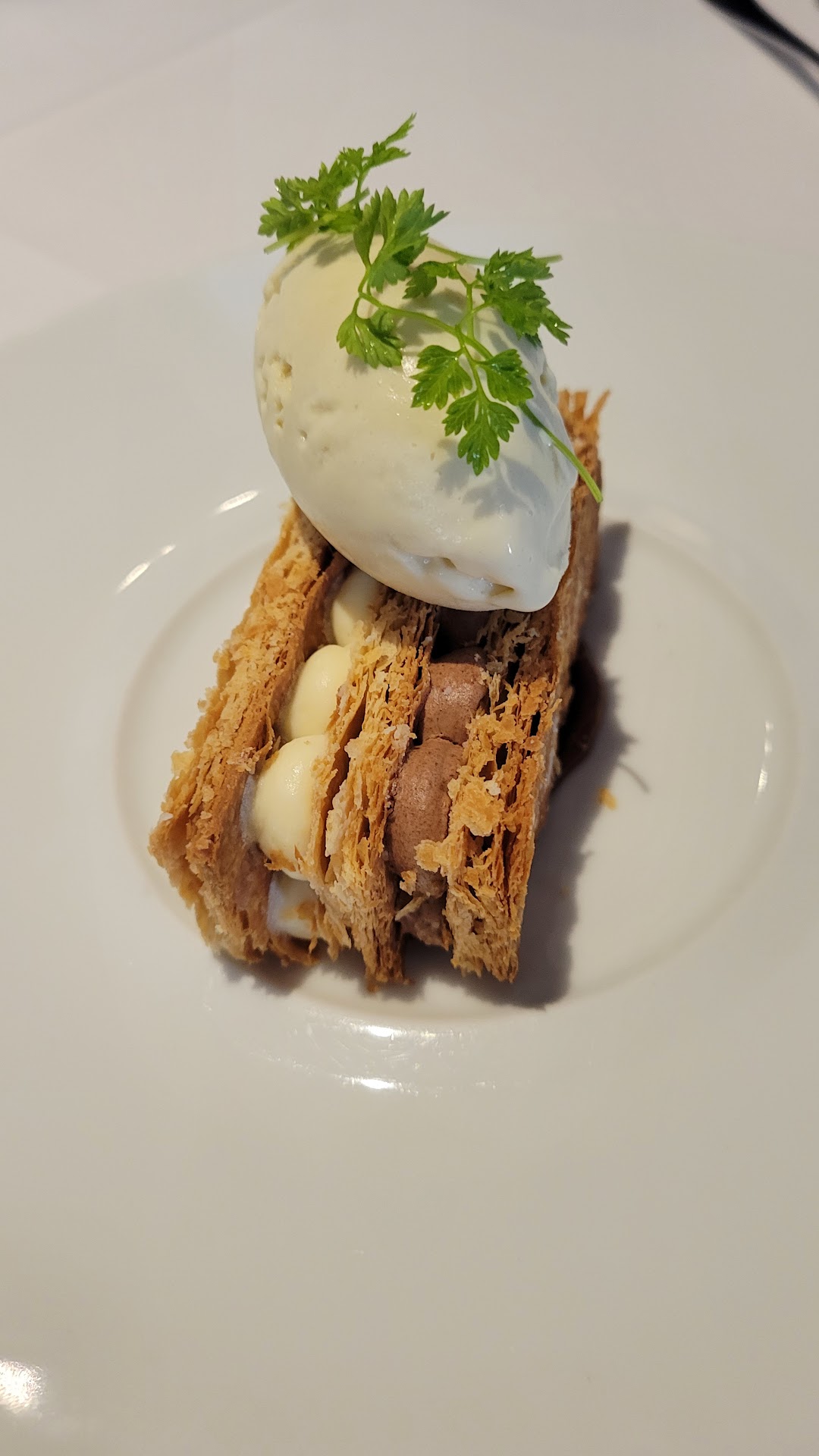Read moreMy husband and I had seen high reviews about this restaurant and decided to try it for our 28th wedding anniversary (July 5). It was beyond what we expected. The absolute epitome of Fine Dining. From the atmosphere, the music, the service, and most importantly - the food. Everything was done to perfection! When we first sat down we were given a complimentary glass of sparkling wine, followed be an amuse-bouche of Pickeral belly with pea shoots and wild leek. Then we were served some focaccia with rosemary and old bay and a whipped butter. Our appetizers were the cauliflower and truffle soup, and the organic greens with almonds, cherry tomatoes with a rhubarb tarragon dressing. What made the salad extra special was the lovely almond butter the salad was set on. Next came a palette cleanser - a small spoon of a sorbet that tasted like apple pie! For dinner I had the roasted lamb with sweet pea puree, pickled onions and mint jus, with braised lamb tortellini. It was incredible! The lamb was done to absolute perfection and the tortellini....well, I could have eaten a bowl of that tortellini itself only and been perfectly happy. My husband had the drie aged beef striploin with potato puree, grilled miatake mushrooms, asparagus and a brandied green peppercorn sauce. Again, the beef was done perfectly. For dessert we had the mille-feuille (shared). It was absolutely delicious! The experience was made all the more special by the wonderful service provided by our server, Jenn. She was an absolute delight and described every single course in detail. Thank you to the wonderful staff, and the amazing chef's. ...