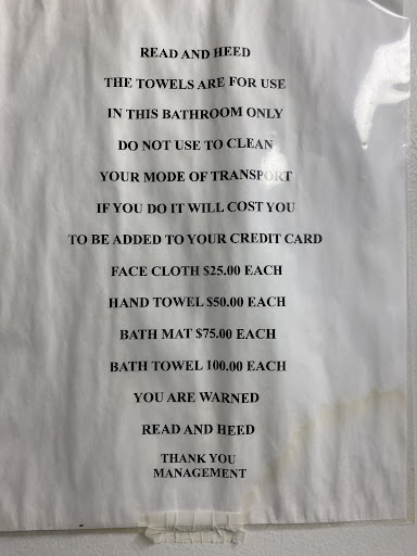 Read moreVery much a motel. Was not greeted when checking in. Waited 5 minutes while the person did something on the computer, then they asked for cc and said room 3. That was the total conversation.||Unwelcoming sign posted in the bathroom of the room.. see photo.||Room was relatively clean. Bedding was simple motel style. Plate and cups in the bathroom were clearly dusty and hadn’t bern wiped in a long time. There was no hand soap or shower items, had to call and have them brought over. Towels were clean but rough. No housekeeping services during our 3 night stay. Not great lighting.||No thermostat in the room. First night was too hot with the heat going, other nights were too cold with no heat going.||Room doors are a simple door handle, no deadbolt or extra lock on the inside.||Used the room for only sleeping because we were out exploring morning til night.||Would not...