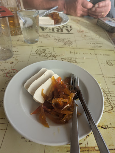 I found fish carpaccio on the menu, which I took to be the Cerviche referred to in the guide book, and ordered it. My husband ordered the tropical tartar for starter. My carpaccio was tremendous and my hubby's tartar was fabulous too. We had a fish mixed grill and a meat mixed grill for mains. And then a staple of Cape Verdean dessert menus, goats cheese and papaya jam...this was a revelation and absolutely delicious.