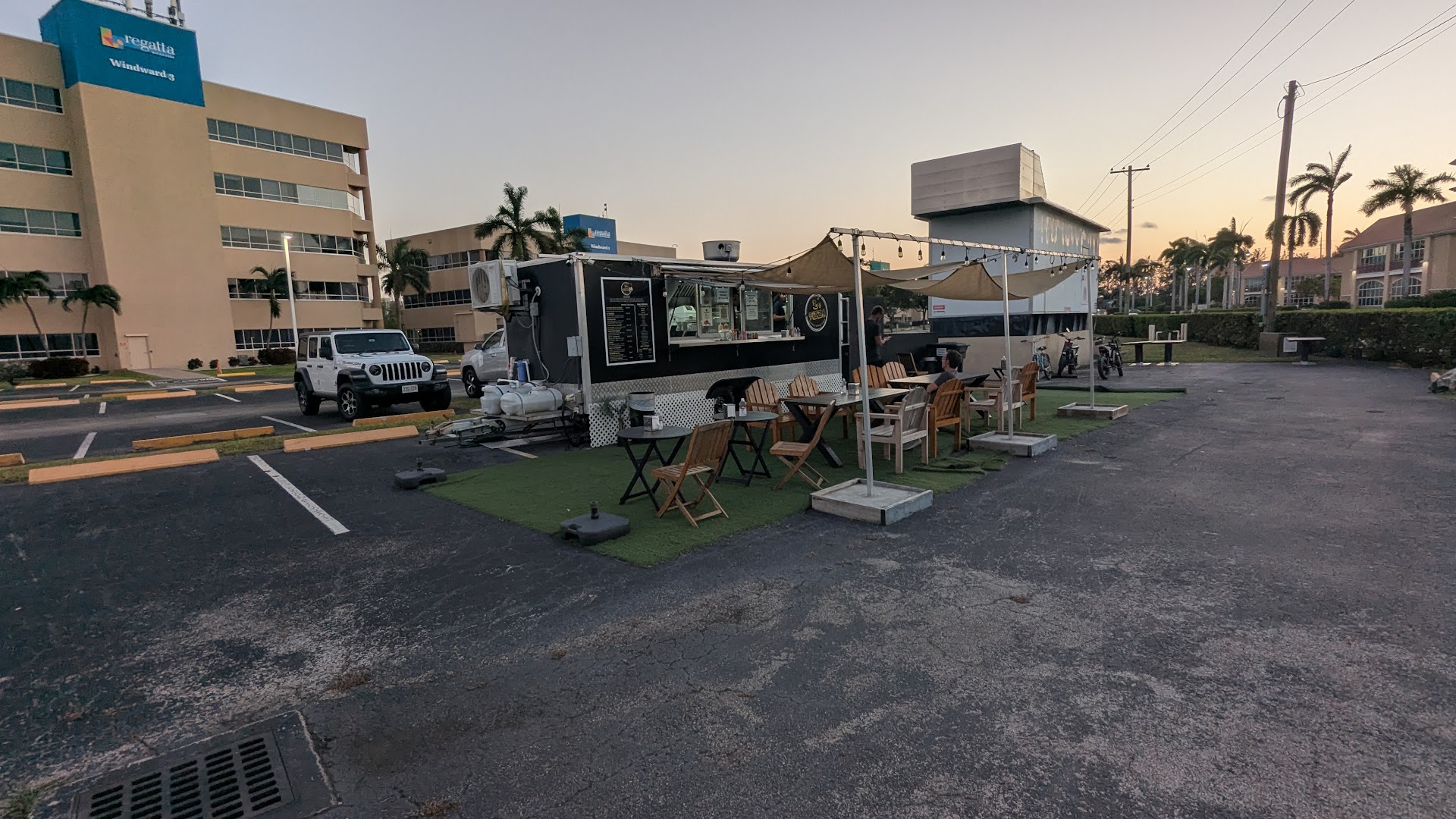 Read moreTook my wife here during our vacation. Unless you looked at the pictures you wouldn't know it is a food trailer, so if you want to sit in the heat your in the right place; otherwise be prepared to take it back to your room. The cashier was cordial and prices seemed reasonable, at least until you find out they only come in one size, which was equivolent to an ipad. Don't let the stacked boxes mislead you, because it slides around freely in the box. After ordering the toppings, we ended up paying 50% more, or the cost of another basic pizza. The final total was $45 USD for two. They didn't take credit cards, so we had to pay in cash. The guy at the window explained they were being audited, which begs the question, why change your accepted payment method, unless you have something to hide? Asking for extra cheese cost $5 and it didn't even look as if it had the original cheese to begin with. Overall the pizza was good and thick, but it would have been better just to get...