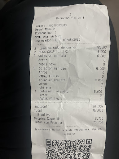 Read moreMala mala referencia jamás comer allí pésimo todo hasta nos robaron nos cobraron platos de más terrible más de 20 mil pesos de más nunca vayan más pésimo pésimo como se atreven a cobrar demás la peor reputación nos cobraron bebida demás platos de más terrible nunca nunca vayan a comer allí y ni el teléfono contestan para hacer el reclamo me cobraron de más dos lomos saltados y una bebida adicional...