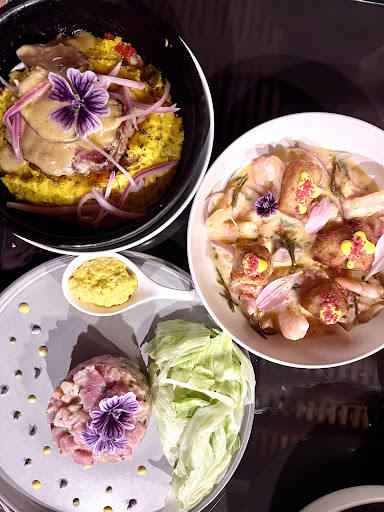 We ordered the ceviche salmon tartar the cooked salmon and res y setas and passion fruit juice.