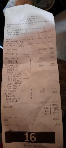 Read moreSe demoraron muy poco en tener mi pedido...eso es genial verdad?? Pero me pareció extraño, siempre se demoran entre 3 o 4 o más minutos, pero esta vez medio minuto y ya estaba mi pedido??.. bueno lo tomé y nos fuimos al auto, pero al ya tomar la carretera tome las papas fritas estaban heladas, ni siquiera tibias, heladas!! Tiesas de heladas, no se pudo reclamar ya que nos habíamos ido en el auto. (Este local esta en plena carretera) desde que salimos del local el auto y a la carretera, pasaron 2 minutos... Menos!! la vez anterior que pase...tambien tuve una mala experiencia con mi compra..dije nunca más a este local...pero pasamos igual🤦🏻♀️.... esa vez en la amburgueza me salieron 2 pelos.. si pelos!! Y de dudosa procedencia, si de esos mismos,!!guacala🤮 votamos toda la compra (lo que nos quedaba, y yo con náuseas por varias horas) y pasó lo mismo que no nos podíamos devolver, esta vez la rebice entera antes de comerla, no le encontré nada pero la comi con miedo a que saliera algo raro!!!.y me quedé con ganas de comer papas fritas🤷🏻♀️. no volveré a comprar en ese lugar... Y Si lo hicimos esta vez fue solo por qué estaba a la pasada de nuestro viaje. "Revicen...