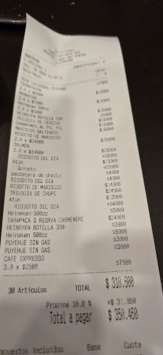 Primera vez en este restaurante y la verdad es que tengo sensaciones encontradas. Voy a partir por lo bueno. La atención del personal fue muy buena, siempre respondieron a todas nuestras consultas y también nos hicieron sentir como en casa, este es un punto no menor, dado que por ellos no califico peor nota. Con respecto a los tiempos de los platos, fue muuuucha la espera, alrededor de 1 hora y el local no estaba lleno. Por otro lado, en general creo que los platos están sobrevalorados, que venga bien presentado no significa que tengas que inflar el precio para aparentar ser gourmet, lo verdaderamente gourmet es cuando la comida tiene balance, sabor y buena ejecución. Se supone que las sugerencias del chef son aquellos platos que no pueden fallar, en ese sentido pedi la merluza empanizada rellena y me arrepiento tanto, nunca pensé que iba a llegar un asco de plato. El empanizado quemado y duro, lo que hace que sea muy difícil de partir, el sabor amargo y la merluza sobrecocida, adicionalmente, el relleno excesivamente salado. Esperaría eso de un local que no cobra 20 USD por este plato. Así también, el risotto del mar, excesivamente cargado a la sal, y no estoy exagerando, soy una persona que le gusta la sal pero tuve que pedir otro vaso de agua para pasar el mal rato. Como dije, son platos cuyo valor es alrededor de 20 a 25 usd, y la ejecución y calidad NO LO REPRESENTA. Puntos a destacar la paila marina que tiene mucha variedad y sabor, diría que es lo mejor que tienen. Creo que cómo oportunidades de mejora está el tiempo de espera por los platos, en restaurantes con precios elevados no puede superar los 30minutos, y otro punto de mejora es la ejecución de los platos, no pueden solo pensar en la presentación si no también...
