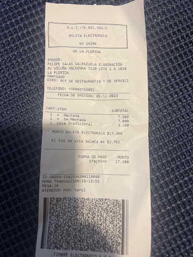 Que decepción mas Grande hoy a la hora de almuerzo, llego al mall Vespucio, y veo el nombre de su local, y me voy a la segura digo yo, con un sándwich tradicional, yo pedí uno de mechada chacarero y mi hijo Un mechada s.w la demora fue exactamente de 27 minutos, pero hasta ese momento no había problemas, lo decepcionante fue al degustar una Carne Mechada, sin sabor a nada, como si la hubiesen tenido demasiado tiempo lavando o algo así, ya que no tenía a sabor pero a nada, los piropos verdes y el tomate , nunca lograron tratar de dar un pequeño sabor a un verdadero mechada, el otro sándwich que pedimos lo mismo en cuanto a su sabor y textura, cero pero cero sabor a ese típico sándwich o chacarero que uno espera disfrutar, fue un verdadero fiasco haber pasado y pedir semejante comida en su local.. no se a que se deberá tan mala sazón y decepcionante experiencia de vuestro local, deja mucho que desear de un local tan famoso en la gastronomía típica Chilena.. espero que mejoren su cocina, por que con esos sin sabores en estos sándwich tan típicos y tradicionales, creo que no llegarán a ni un puerto en lo que que se refiere a un local de comida típica criolla..adjunto boleta...