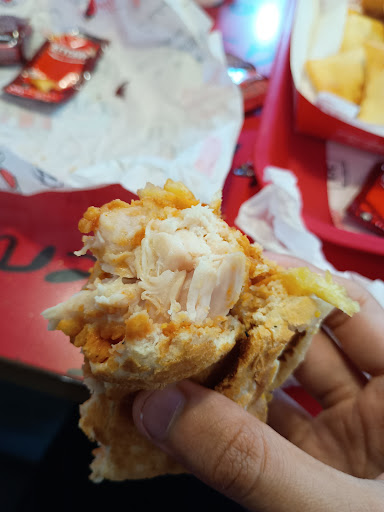 El local estaba vacio, y sorprendentemente limpio para un restaurante de comida rapida, habian unos pedazos de comida pero muy pocos y en esquinas donde uno no los ve, las mesas y espacios estan super limpios La comida, Las papas fritas y empanadas estan bien, todo normal, pero principalmente fui por el pollo, no se si era por un tema de luz pero el pollo se veia un poco rosado (como se muestra en la imagen), pero sabia normal y como siempre, no me quejo de nada, pero la bebida, uy la bebida es lo que me fue mal, yo tomo pepsi literal todos los dias (un poco insaludable de mi parte) y no falta ser un experto para notar que algo esta muy mal con la pepsi, teniendo un sabor mas de caramelo y extraño que la pepsi de todos los dias, me tome un vaso entero lentamente y no me dieron ganas para tomarme el segundo debido al extraño sabor de la segunda pepsi, cual honesto, sabia mal, y eso que soy fan de esta bebida. Los empleados me trataron super bien y me ayudaron con el menu y cupones en el kiosk, muy amables, se pasarón.