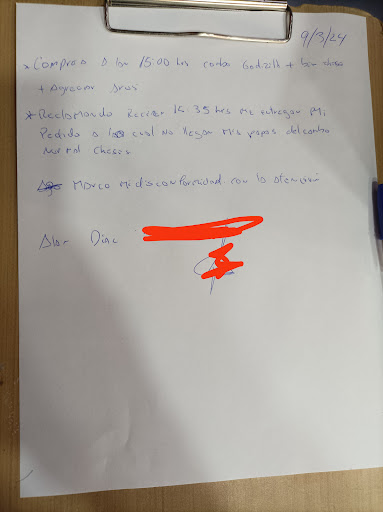 Ayer tuve la peor experiencia el día de ayer a la 3 compré y recién a las 3.35 me llevaron algo ni siquiera toda la comida, y eso porque reclamé realmente ni siquiera tenían libro de reclamos en la tablilla de reclamos para verificar el pedido se quedaron. Con la boleta no llego nunca toda la comida y no me devolvieron la boleta realmente son un excelente producto pero el día de ayer fue un asco ni siquiera la supervisora o encargada de local salió a dar algo solo mando al pobre cajero quien algo intento hacer pésima si gestión y organización 35 minutos de espera para lo incompleto que llegó foto del gran...