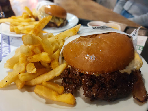 Read moreRealmente una experiencia, el lugar hermoso, sigue la estética del MUT pero tiene un distintivo que lo hace resaltar, con sus carteles coloridos y un local que te envuelve desde dos veredas, haciendo que pasar por ahí sea inmersivo. Lo que concierne: la hamburguesa. En general, los precios bastante aceptables, no baratos, tampoco caros considerando que cualquiera viene con porción de papas fritas, estas son sumamente ricas, pero cuentan con un aliño que hace que al comer junto con la hamburguesa el sabor de estas últimas se opaquen, para mi gusto muy saladas. La hamburguesa por su parte era muy sabrosa, cada uno de sus ingredientes denota una calidad buena, y la carne smasheada con su característica costra, era perfecta; no obstante y de ahí su calificación, cuenta con un error garrafal: el envoltorio primero que nada mancha, será la tinta o algo pero deja las manos negras, y por tanto la hamburguesa también. Por otro lado y lo peor, es que la forma en que vienen envuelta hacen que por muy inmediato que se consuman, estas vienen HUMEDAS, el pan se nota que es fantástico, luce genial, pero su sabor se pierde y estropea, por culpa del envoltorio, no exagero, están mojadas y la hamburguesa se termina desarmando, gran error. Vaya y haga su propia opinión, los precios son entre 10 mil y 15 mil por persona, conozca el lugar que es muy lindo, yo si lo recomiendo, pero no para ir...