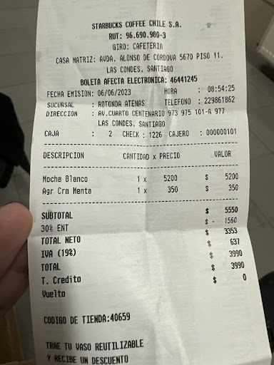 En general todo muy lindo y limpio. Buen ambiente y ordenado. Las preparaciones rápidas y el personal muy amable. El aire acondicionado es bajo , no da frío (como en otras sedes). Lo único que podría acotar sería que ya que muchos vamos a trabajar o estudiar, la musica ojalá fuera mas suave o un estilo no bailable. Tambien, el día que fui (me senté lejos del mesón) el personal estaba muy ruidoso en un momento, conversando muy alto de un extremo a otro y se escucharon muchos garabatos ,...