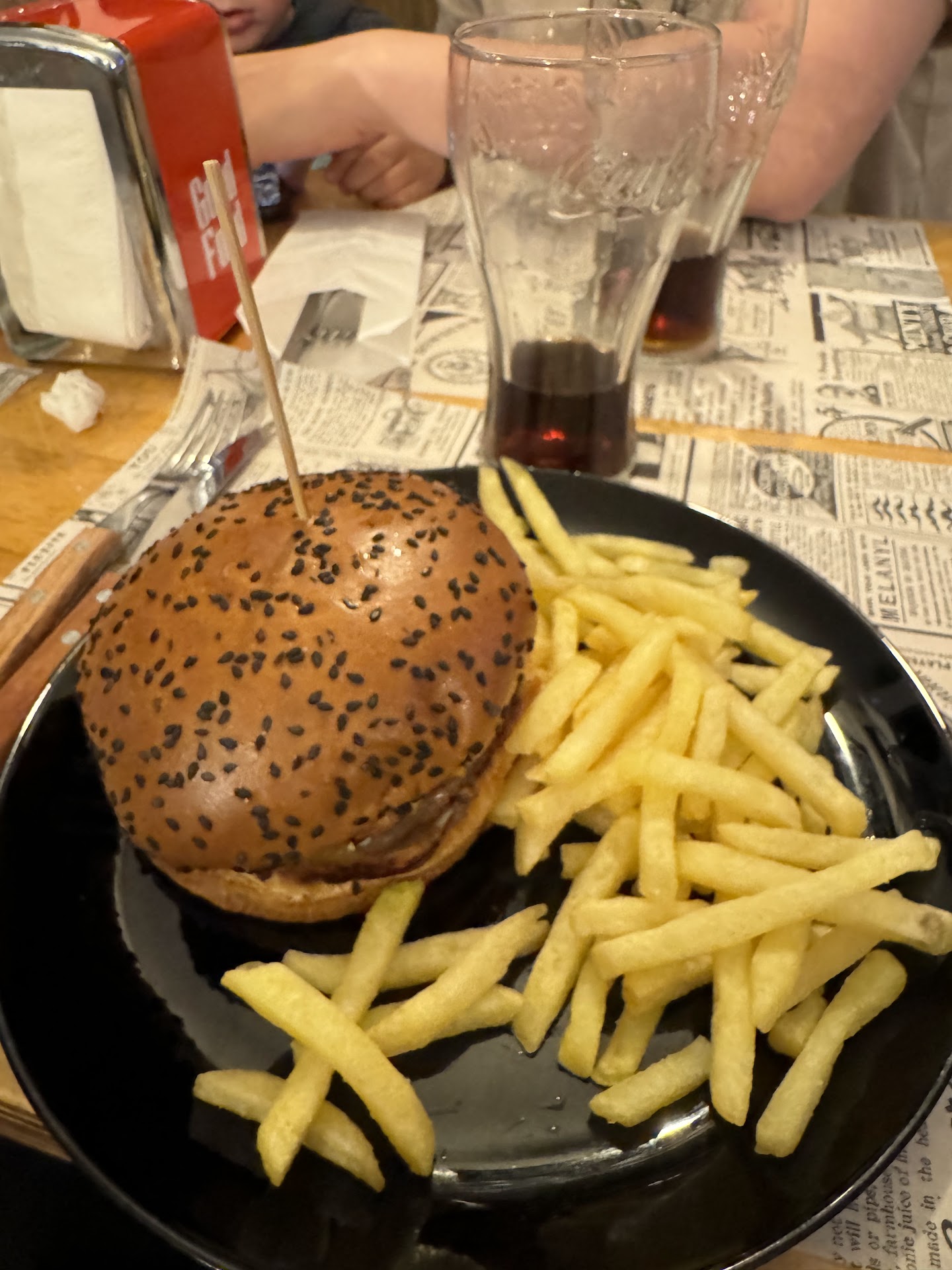 Fuimos tres adultos y dos niños. En total fueron seis hamburguesas con papas fritas y dos Coca-Cola de litro y medio.