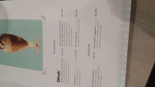 Read moreSiendo que este Coppelia un lugar tradicional de los más antiguos como salones de té en Santiago no se condice la calidad del producto y tampoco el valor probamos la torta reina Sofía $ 3.390 que al parecer por imagen prometía pero al probar el producto ...ofrece una crema que dice ser chantilly pero me da la impresión que es crema chantilly artificial con mermelada de frambuesa y hojarascas algo congeladas en algunas partes. El chocolate caliente con un precio que sobrepasa por lejos su calidad (chocolate instantáneo) $3.290 sólo tenía sabor azúcar pero ningún gusto en particular que lo diferencia de otros lugares. En resumen Si quieres tomar un chocolate caliente de buen sabor Compra en la competencia de Marley Coffee por $1.200 por lejos mucho mejor que Coppelia en sabor . Me declaro un fan de los lugares con historia pero con productos que valga la pena pagar mas. NO LO...