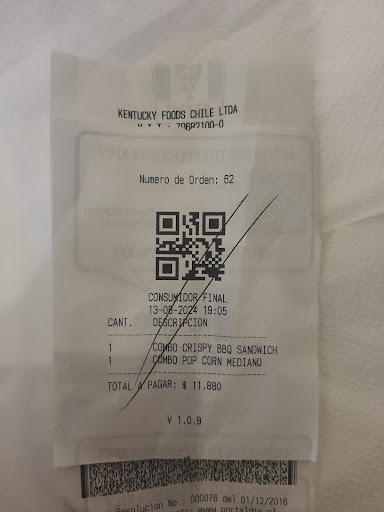 Read moreHoy de visita en el mall quisimos almorzar en el patio de comida y opte por KFC y fue un gran error. Pedi una promocion de $5.990 que consistia en dos presas de pollo,papas fritas, bebida y realmente fue muy decepcionante. La cobertura del pollo que es lo que caracteriza a KFC estaba dura y al parecer refrita al punto que la carne de pollo no se sentia y era casi imposible de poder mascar con seguridad. Entiendo que problablemente por el precio no sea de la mejor calidad pero si a esto sumamos la atencion...ufff. No reclame y solo deseche mi pedido y opte por no generar problemas por que no es mi costumbre. Ojala puedan en algun momento certificar la calidad y revisar los protocolos de atencion. Espero esto lo tomen como una critica que aporte a mejorar...