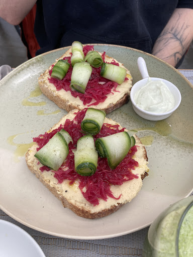 We had the salad of the day, a great mix of fresh, seasonal, and delicious ingredients, topped with roasted and caramelized nuts and home-made pickles (which were so extremely good that I’ll try pickling myself in the future), and served with an incredibly wonderful combination of sweetness, sourness, and saltiness in a lime-and-soy-based dressing. This was accompanied by a mouthwatering curry of potatoes, mushrooms, coconut cream, cauliflower, bell-peppers, and many more. Finally, we also wanted to try some bread, so we had the toast with humus, sauerkraut, red cabbage, cucumber-rolls, and a freshly delicious sauce. Our two smoothies brought us initially back to life, and the wonderful food sent us into the dimension of enjoying life’s best foods in a whirlwind of deliciousness. Afterwards, we took some delicious Apfelkuchen to go, to eat in our hotel. Perfect. In short, it is a delicious place and we highly recommend going...
