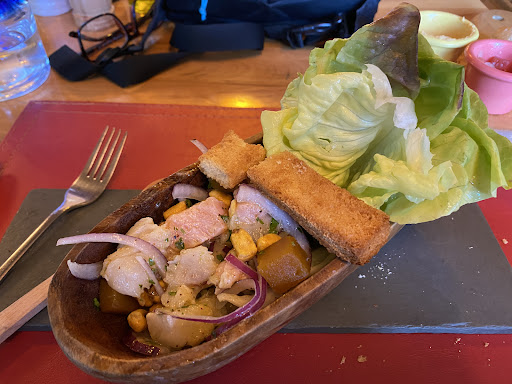 For my first course, I tried the ceviche, which came highly recommended by a fellow diner. Having tasted incredible ceviches in Peru, I was eager to compare, but sadly, this one didn’t deliver. The marinade lacked flavor, and the two types of fish—salmon and a white fish—were overcooked in the acidic juice, leaving the texture unpleasantly tough.