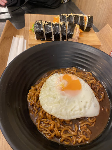 Los sabores del lugar estaban increíbles! Si solo evaluara eso les daría un 20 de 10. Solo recordar lo que comí y se me hace agua la boca, porque creo que los platos estaban muy bien logrados. Los fideos eran bien picantes, pero deliciosos!! El sabor completo, bien logrados, lo mejor. Los kimbap tenían variedad de verduras, huevo y uno con atún, y si bien tienen aspecto similar al sushi, su sabor es diferente y riquísimo.
