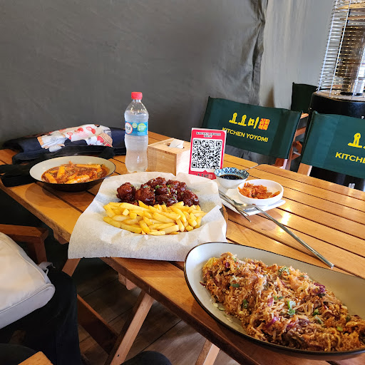 Ayer pase por casualidad y aproveche de almorzar ahí. La comida se demora en salir pero es rica pedí pajjeon y es una tortilla de camarones de 30 cm, así calculando al ojo muy buena y bastante llenadora la recomiendo al 100% el menu es bastante variado aunque hay muchos platos con pollo a mi parecer, pero también vi en YouTube que la comida "rapida" en Corea también es a base de pollo. Lo que sí extrañe es ese agregado a parte creo que se llama baccha donde te ponen varios pocillitos con cosas para picar, para que no se sintiera la espera. Lo otro se me hace un poco raro comer bajo una carpa en la calle no se me hace malo solo raro en verano esta super pero me hace pensar y en invierno? Y si llueve? Pero bueno no es lo que nos tengamos que preocupar por ahora si queremos ir a comer. También tenia unos ramens que me encantaría probar pero con este calor no se si sea tan buena idea. Sobre los precios están bastante parejos con otros locales que hay por el mismo barrio. Por mi parte recomiendo ir aunque advierto que si te desagradan esas sillas de director de cine será un poco incómodo estar tanto tiempo esperando o te sentirás muy bajo para la mesa. Fuera ese pequeño detalle todo...