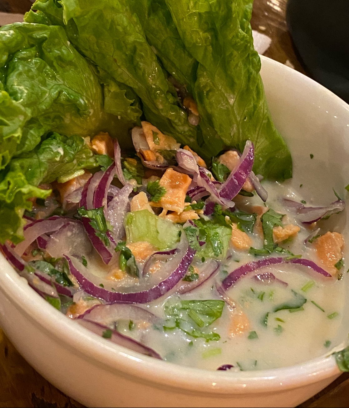 The seafood platter came with fried calamari (rubbery), salmon ceviche (odd, slimy texture and too sour), shrimp empanadas (flavorless filling) and a shrimp in some aji ajillo sauce (sauce again was odd tasting and too acidic).