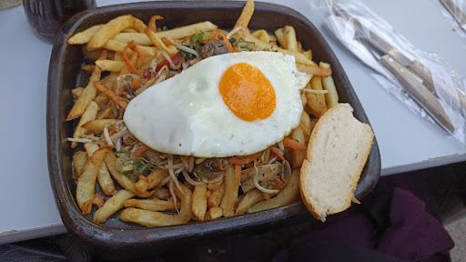Read moreEn relación a los otros locales del sector, es de los que tiene "menor" precio. Lo bueno, las papas fritas eran crocantes, la chorrillana vegetariana y salsa de ajo exquisita, y los tragos ricos ricos. Lo malo, los meseros no manejan la misma información. Eramos un grupo de 5 personas, y pedimos chorrillanas individuales (7.500). Al rato, queríamos pedir 2 chorrilanas para 2 personas (por 13.000), pero nos informan (nuevo Garzón) que por tema covid, son realmente 2 chorrilanas individuales no 1 más grande. Algo que nos descolocó, ya que no nos informaron esto cuando pedimos 5 un. a 7.500 c/u. Preguntamos a qué hora empezaba el happy hour, y nos dicen (luego que ya nos habíamos terminado los tragos), que ya estaba la promo, y que podíamos pedir. Quisimos pedir dos micheladas, pero luego que uno de los meseros sí nos dijo que entraba en la promo, el otro después dijo que no.