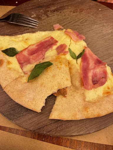 Por otro lado mi pareja pidió una pizza bianca tocino, que la verdad esto fue lo que me llevó a escribir esta crítica, porque la pizza, de pizza, ademas de ser redonda y tener queso, no tenía nada, una masa horrible, sin fermentación, se descascaraba, parecía más un pan pita que una masa de pizza, con una textura rarísima, y que arriba traía unas lonchas de queso y unas de un tocino de bajísima calidad con unas cuantas hojas de albahaca. Adjunto una foto de la "pizza" para se observe la mala ejecución de esta. Quiero dejar en claro que no siempre uno puede pedir una pizza de altísima calidad en restaurante que no se especializa en ello, pero al menos, esta debe tener un buen sabor y una buena consistencia y la masa, la masa es el actor principal de una pizza y que se deja atrás para solo ponerle topings.
