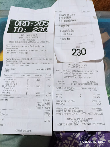 El día de hoy 17 de mayo pasé a almorzar al Mc Donald's de alameda con santa rosa en el centro de santiago. Para hacer el pedido utilicé un tótem de autoatención y al finalizar el pedido seleccioné la opción de que el pedido fuera llevado a la mesa, se ubicó el número de la mesa y se ingresó el pedido, al momento de pagar una chica se me acerca y me dice que tengo que retirar en el mesón, le pregunto por qué y me dice que solo pidiendo por la aplicación se puede pedir que el pedido se lleve a la mesa, le digo que entonces por qué el tótem da la opción, no me contesta y finalmente me deja pagar el pedido. Luego subo al segundo piso y había unas personas en la mesa, les pido que si nos pueden dejar sentarnos ahí ya que pedimos a la mesa y llegará a ese número, no se complican y se sientan en la barra de enfrente. Nos sentamos a esperar el pedido y una sra del staff comienza a insultarnos y palabrearnos (a una distancia de 2 mt aprox) que eramos unas rotas, mala clase, etc. Yo le respondo que el pedido iba a llegar a ese número de mesa pero ella solo nos palabreaba sin escuchar (demás está decir que el segundo piso estaba con mucho público y todos nos miraban, obviamente siendo muy incómodo todo) Me paro, busco a la sra con la boleta en mano y al encontrarla le digo que por qué me gritoneo y no fue a la mesa a decirme directamente todo ese palabreo, le muestro la boleta y le digo que el pedido llegaría a esa mesa, que yo pedí educadamente a las personas si nos podían ceder la mesa ya que el pedido llegaría ahí (no fue algo antojadizo y además habían más mesas libres, de hecho habían otras personas pidiendo en los tótem de arriba que el pedido llegara a la mesa) la única diferencia es que mi acompañante bajó a ver por qué demoraba en subir y claro, la mesa quedó sola unos minutos. La sra que me palabreo me dijo que la anfitriona la había mandado, yo le pregunté y por qué la anfitriona no fue a la mesa a decirme algo, le pregunté donde estaba y me dice ahí parada frente a donde está usted sentada, me dirijo a buscar a la anfitriona y la ubico, le pregunto por qué envío a una subalterna a palabrearnos y no se acercó ella a la mesa, me mira de manera despectiva y simplemente me da vuelta la cara y no me responde, le pido que me de su nombre (ya que no lo tiene visible) y me dice que no me lo va a dar, le digo que yo puedo solicitarlo y que ella me lo tiene que decir, me responde que no y se va. Bajo a pedir hablar con el gerente de la tienda y le explico la situación, me dice que los pedidos a la mesa son solo por la app etc, entonces yo le digo que si no se puede solicitar por el tótem aunque da la opción, que deberían poner algún tipo de aviso, y que más allá de eso los funcionarios no pueden tratar así al cliente, que debe haber un mínimo de respeto, no puede ser que una anfitriona mande a palabrearnos y que luego al encararla sea falta de respeto y simplemente me ignore y al pedir su nombre se niegue a dármelo. Le digo a la gerente Sandy Rosales (supongo que es su nombre porque tampoco tenía la piocha visible) que me de el nombre de la anfitriona porque quiero dejar un reclamo, me repite su nombre y me dice que no me lo dará porque ella es la responsable de su personal, a todo esto la anfitriona se encontraba atrás de la gerente con una cara burlesca, ya que la sra no me había dado su nombre. Volví a insistir en que necesitaba el nombre de la anfitriona y simplemente me lo negó. A estás alturas comprenderán que se había arruinado el almuerzo y que si no lo devolví y me fui es porque ya no quería alargar el mal rato. Adjunto la boleta de el pedido.