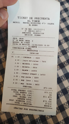 Read moreFuimos a su restaurante y quedamos profundamente decepcionados al constatar que no cuentan con los insumos necesarios para preparar los platos ofrecidos, ya que el personal debe improvisar y salir en horario laboral a comprar a un supermercado cercano, lo que no solo retrasa y baja la calidad del servicio, sino que también expone a los trabajadores a cumplir funciones ajenas a su contrato —posiblemente ilegales— y compromete la seguridad alimentaria de los clientes al no respetarse la cadena de frío ni las condiciones básicas de inocuidad, por lo que exigimos medidas inmediatas o de lo contrario elevaremos esta denuncia ante la Seremi de Salud y la Dirección...